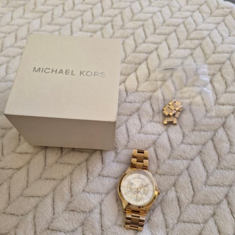 Hyvässä käytetyssä kunnossa Michael Korsin kello (malli 5925). Kello on aikoinaan lyhennetty sopivaksi, jatkopalat tallessa. Pieni naarmu kellotaulussa ja tavallista käytön jälkeä rannekkeessa. Kellosta on paristo loppunut, vaatii vaihdon.