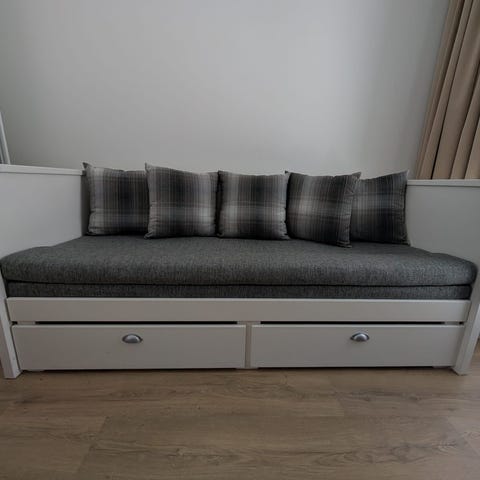 Laadukas kotimainen vuodesohva. Ht collection Donna sarjan vuodesohvaversio. Verhoilukankaana valkoinen Cottonline puuvilla. Kaikki päälliset irrotettavat ja pestävissä. Jalat alumiinia. vuodekoko 140*190. Myymälän mallisohva. Normaalihinta 3882 €. Alennettuun hintaan sisältyy Kaukokiidon pihaantoimitus.