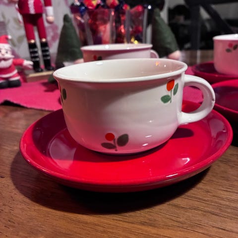 4 Lautasta, Kolme pikku mukia ja kolme isompaa kahvimukia. Mukaan saa halutessaan tuon neljännen kahvimukin myös, mutta huom särö (kts kuva.