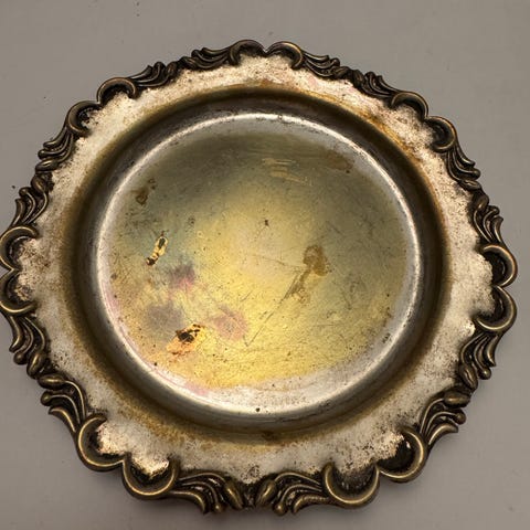A. Mykkänen Taidetakomo Oy:n valmistama alpakka-lautanen/tuhkakuppi. Kuviona Oinas?Leimat AMY, ALP ja 441. Ok kunto.