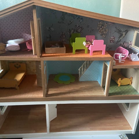 Hyväkuntoinen puusepällä teetetty uniikki nukketalo 1990-luvun lopulta. Toista samanlaista ei ole, tämä on sisustettu itse hankituilla ja valituilla materiaaleilla. Talossa on kolme kerrosta, ”parketti” lattiat (muovimattoa), erilaisia tapetteja kaikilla seinillä, portaat kerrosten välillä, upea ”punatiili” takka ja savupiippu, ompelijan ompelemat verhot kaikissa ikkunoissa - leikkiä voi kahdelta puolelta, toiselta puolelta saa myös katon käännettyä ylös.