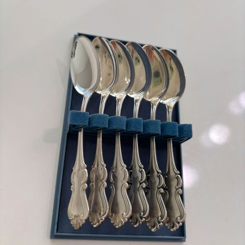 Kaapissa tummuneet hopeiset kahvilusikat joissa kaiverrettu etupuolelle nimi ja taakse ikä/päivämäärä. Yksi lusikka saanut osumaa ja reunassa painauma.