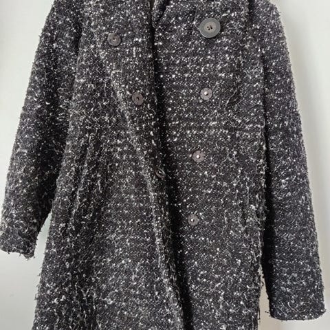 Hyvin paksu ja valtavalla hupulla varustettu vilan musta-harmaa villakangastakki. Piilonapitus ja pituus n. Puoleen reiteen (oma pituus 168cm). Takki on reilumpi kuin koko kertoo, mielestäni vastaa s-m-kokoa mutta hihojen pituus taas on xs-kokoa. Hyvin vähän käytetty.