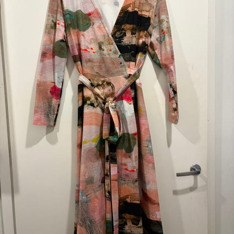 Ihana vähän käytetty Papun mekko. 95% luomupuuvilla 5% elastaania. Pyöristetty helma ja pitkä, menee noin pohkeeseen. Ilmalassa.