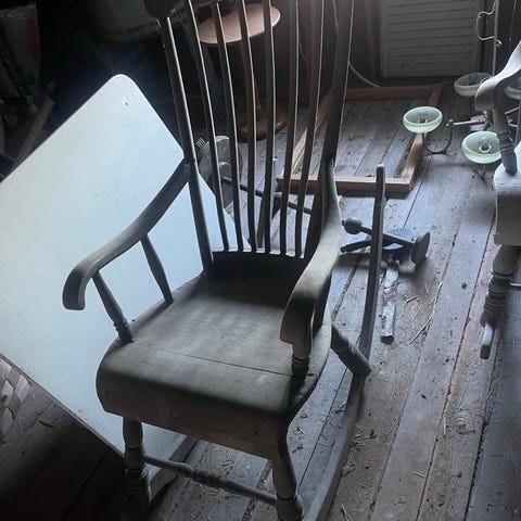 Todella vanha ja kaunis, vähän tavallista pienempi keinutuoli. Istuimessa ja käsinojissa maali pinnassa harmaata, kulumaa tai maalia? Pinta maalattu epätasaiseksi.