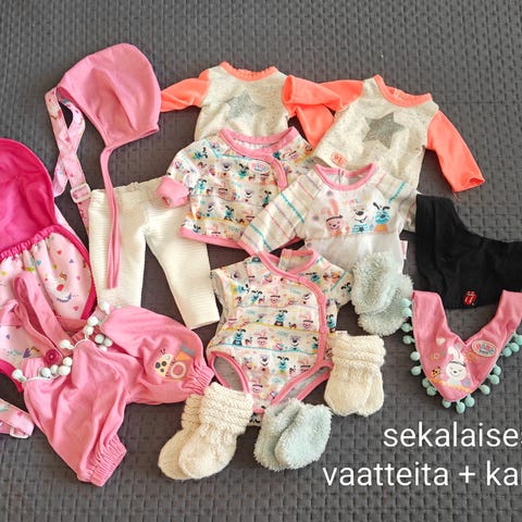 Esim. Baby Bornille ja Baby Annabellille sopivat vaatteet. 3€/setti tai kaikki 3 settiä 6€.