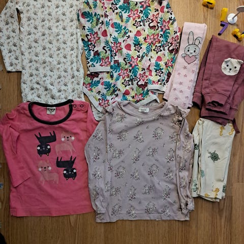 Ihanat puuvillaiset ohuet siistimmät housut (lindex) ja kaksi kauniin väristä lyhythihaista bodya, 80 ja 86 mutta käytetty ja ostettu samaan aikaan (newbie).