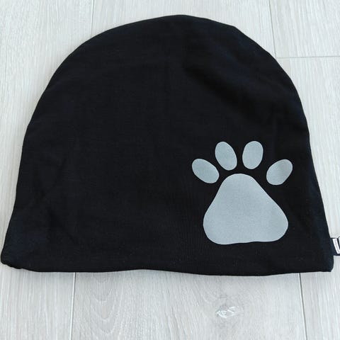 Käyttämätön musta trikoo-pipo heijastavilla pienillä tassuilla. Kotimainen, Nut hat. Py 52 cm. Venyy hieman.
