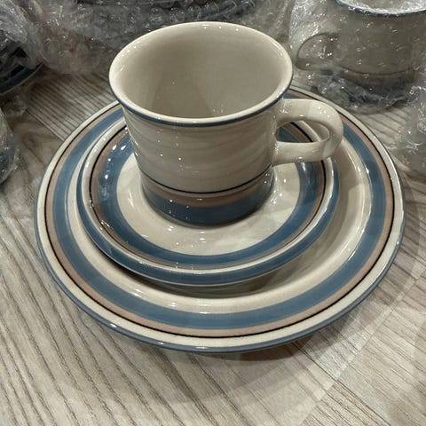 Myydään virheettömässä kunnossa oleva Arabian Uhtua-sarjan kahviastiasto, jossa kuusi kahvikuppia, aluslautasta ja pullalautasta. Kupin korkeus noin 6,5 cm.