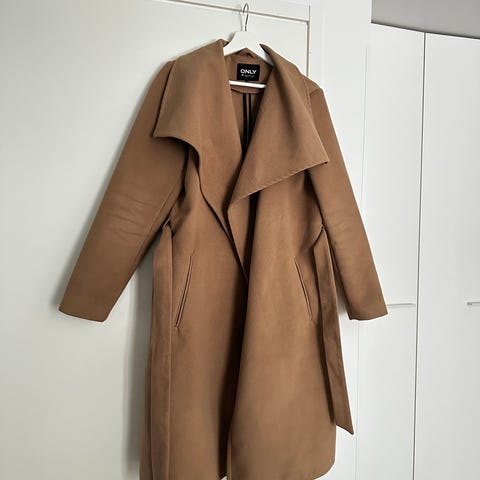 Only:n takki kokoa L. Korkea ribbkaulus. Musta puuvillavuorikangas. Takki suljetaan isohkoilla metallinapeilla ja solmintavyöllä. Takana helmassa riddneuloskaistale. Paljon yksityiskohtia. Taskuja, tikkauksia jne.