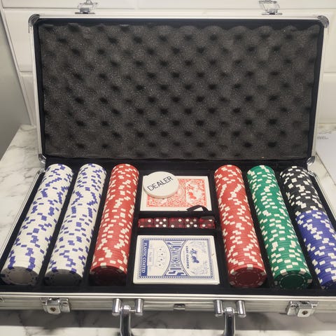 Otsikon ja kuvien mukainen pokerisetti aloittelijalle. Korttipakka, ohje englanniksi ja pelimerkkejä, punaisia 24, sinisiä. 24, keltaisia 25 ja valkoisia 25. Paketissa kulumia, muut osat kuin uusia.