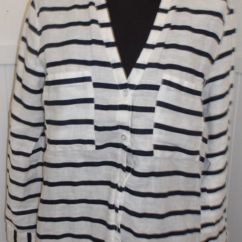 Valkoinen pellavapaita sinisin raidoin lyhenettävin hihoin koko M/L