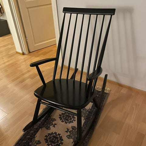 Valkoiseksi maalattu kaunis vintagekeinutuoli.