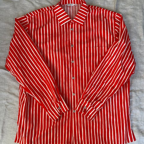 Myynnissä kuvassa oleva Marimekon Suomessa valmistama hiukan vanhempaa tuotantoa oleva naisten pystyraidallinen Jokapoikapaita, koko XL.