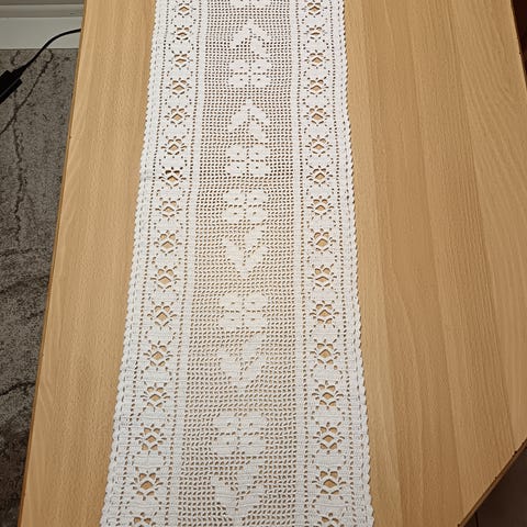 Äitini aikoinaan virkkaama kaitaliina! Käyttämätön (kuvien ottoa varten laitettu hetkeksi esille, muutoin ollut kaapissa). Pituus noin 1,5m. Nappivalinta käsitöitä arvostavalle :)