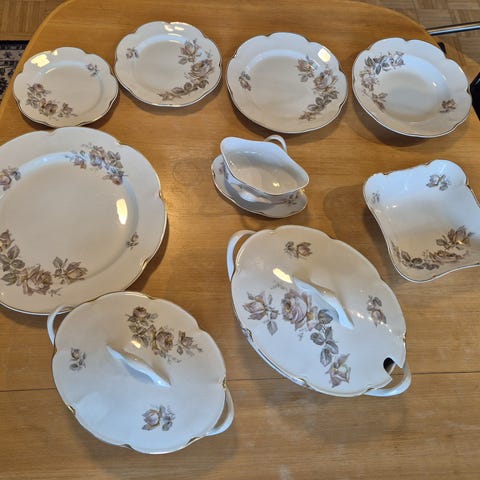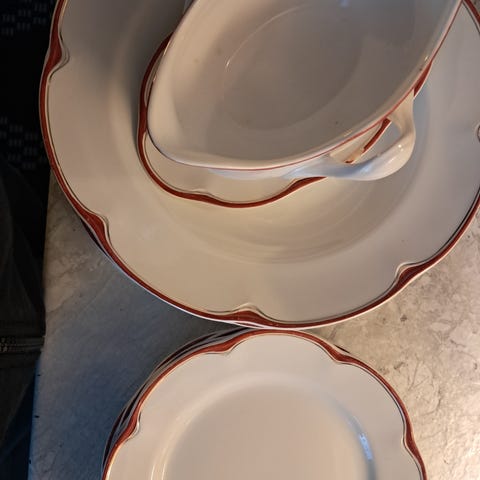 Arabia Diamant lautasia. Osassa piippuleima, osassa kakkoslaatu-leima. Yhteensä 23 lautasta, esim. 7 keittolautasta, ruoka lautasia, leipälautasia, kakkulautasia. Osassa aika paljon kulumaa, varsinkin kultareunuksissa.