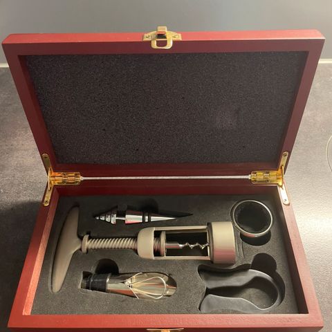 Myydään laatikossa käyttämätön viisiosainen lahjasetti, joka sisältää viinitarvikkeet. Toinen kannen kiinnikkeistä on korvattu erilaisella metallikiinnittimellä.