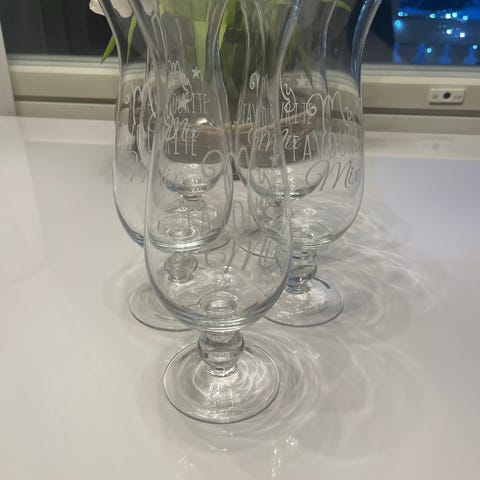 5 kpl virheettömiä punaviinilaseja+ 1 kpl josta teksti lähtenyt pois,muuten hyväkuntoinen.Hinta 10ekpl yht 50e ja 1 ilmainen.