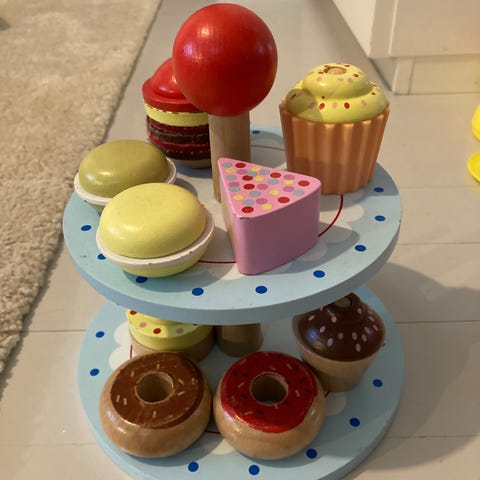 Muffinssin yläosa irrotettavissa ja kiinnittyy tarralla kuppiin. Siistit maalipinnat. Alustan halkaisija n. 13,5cm ja muffinssin korkeus n. 5cm. Merkki Imagetoys.
