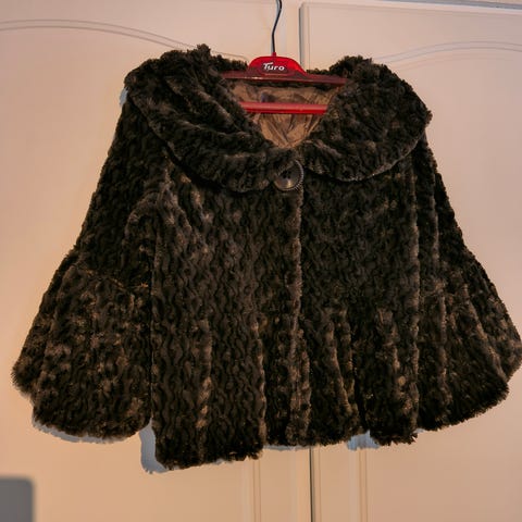 Koko 40–42, pitkä ja väljä malli. Kätevä monenmuotoiselle käyttäjälle, alle mahtuu esim. iso juhlamekko. Olkapäältä helmaan 140 cm, kainalosta hihansuuhun 47 cm, leveys kainalosta kainaloon 66 cm.