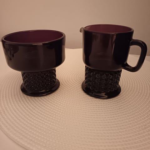 Vuosikymmeniä vanhat, mutta kuin uudet kermakko ja sokerikko. Erittäin ohutta sinista lasia. Kermakko 9cm, sokerikko 7,5cm korkeat. Mukana ehjä alkuperäinen pakkaus. Valmistettu joskus 60-70-luvulla.