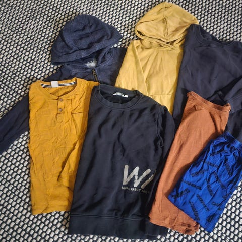 Myydään pääosin paitoja sisältävä vaatepaketti. Mukana yhdet farkut. Kuvasta puuttuu valkoinen pikeepaita ja vaaleat sortsit. Pari paitaa enemmän käytettyjä, useimmat uudenveroisia. Pakettiin saa mukaan paljon käytetyt pyjamat (3kpl) ja halutessa viidet bokserit. Eläintalous