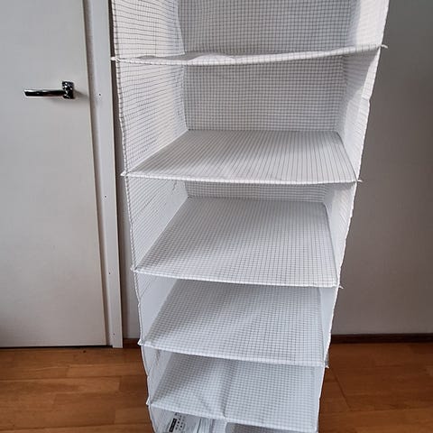 Seinälokerikko / säilytyslokerikko, jonka kangasosan korkeus 48cm ja leveys 35 cm. Väri tuollainen beige / shampanja. Löytyy taskuja ja koukkuja. Kunto uudenveroinen.