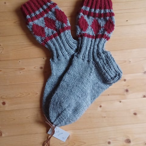 Myydään uudet käsinkudotut villasukat, koko 42-43 (27 cm). Sukissa vahvistettu kantapää. Pesu 40 asteessa. Taloudessa ei ole eläimiä eikä polteta. Hinta 30 euroa.