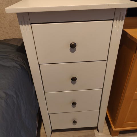 Kaksi Niemen tehtaiden Harmony lipastoa kolmella vetolaatikolla.
