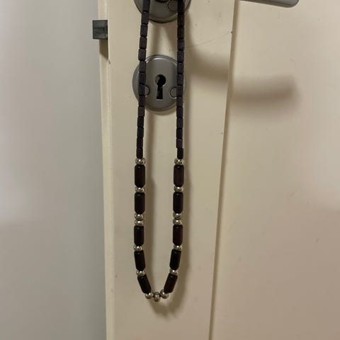 Aarikan sininen vintage puuhelmikaulakoru. Pituus noin 70 cm. Kuminauha hieman venähtänyt ajansaatossa, ei haittaa käyttöä. Muuten erinomaisessa kunnossa.