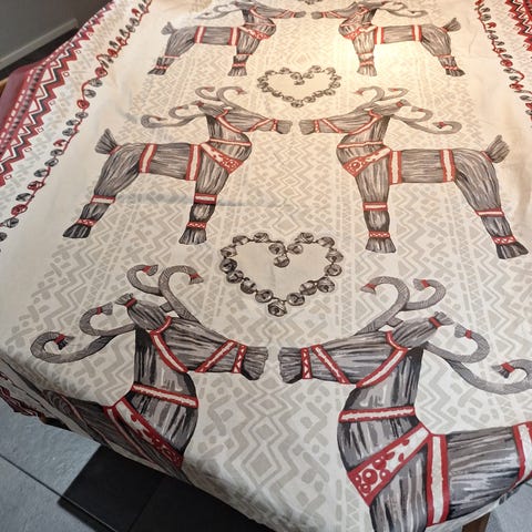 Vallila jouluinen liina jota yhden kerran käytetty eli uudenveroinen Pituus 219cm ja leveys 145 cm.