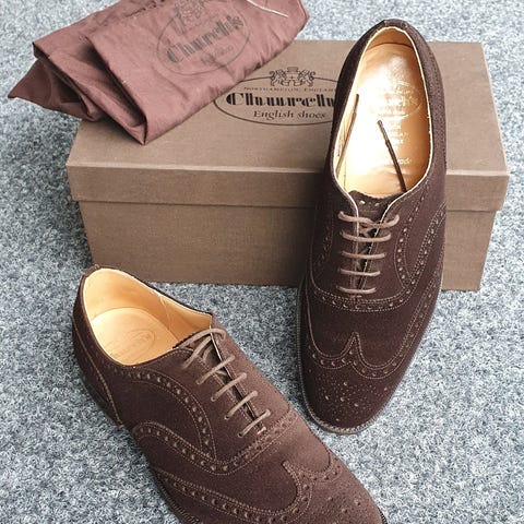 Myydään mustat Church’sin Enmore kengät brogue kuvioinnilla. Kenkien materiaali on vasikannahkaa, pohjat ovat kumia.