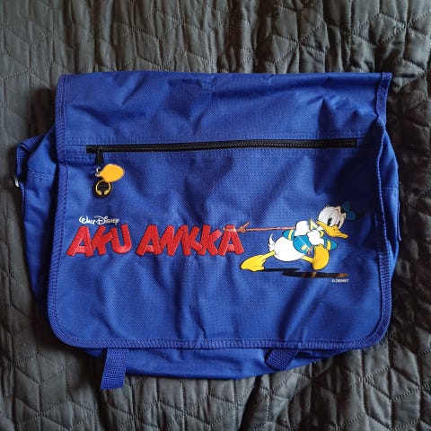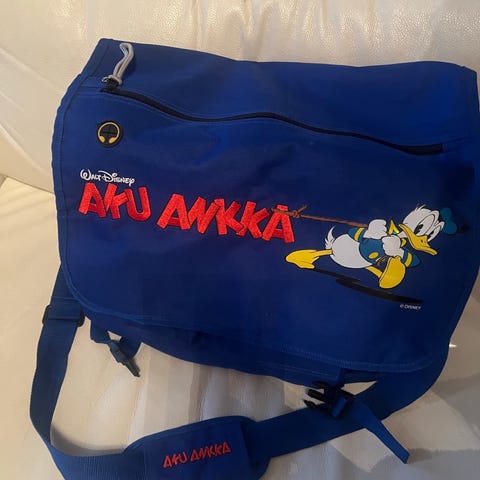 Upea ja näyttävä Aku Ankka olkalaukku, uusi (otettu pakkauksesta vain kuvausta varten). Laukku on monikäyttöinen ja tilava, koko L40 x K 30 x S9 cm. Laukussa on läpän alla tilava tarrallinen tasku (37 x 25 cm) + pienemmät taskut ja kynille omat paikat. Laukkuosaan mahtuu 9 cm paksuinen A4 kansio ja kannettava tietokone (ja sivuun vielä vesipullo). Kestävä materiaali, sisävuori.