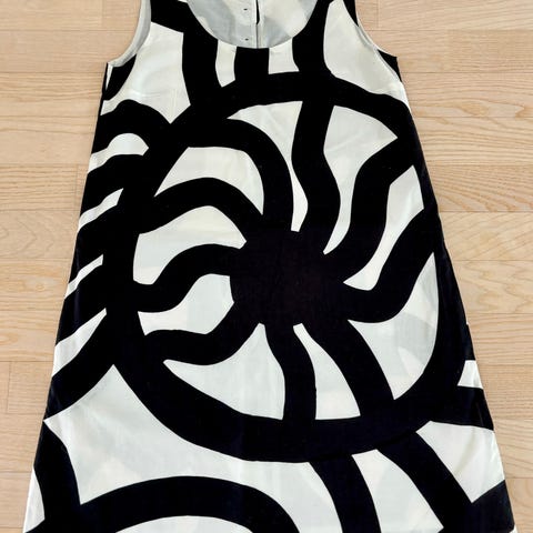 Myydään erittäin hyväkuntoinen Marimekon paksua kangasta oleva Eerika mekko. Mekossa on vuori ja taskut sivusaumoissa. Koko 34. Väriltään ruskea-musta.