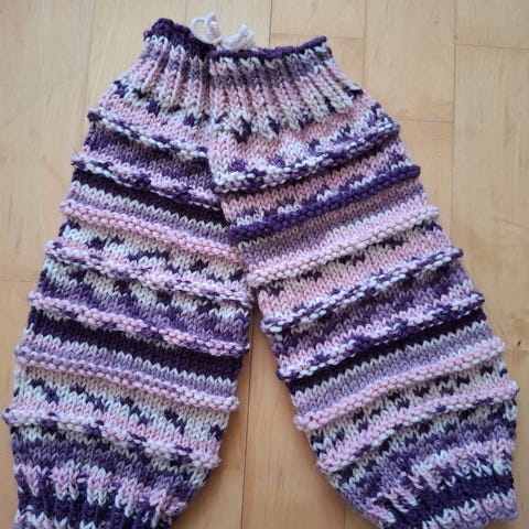 Kuvan säärystimet, kahta eri pituutta, 26cm. ja 28cm Punasilmäiset beiget on 28cm. . Neulottu 7-veljestä-langasta.