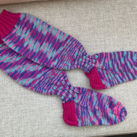 Uudet pitkävartiset villasukat. Terän pituus n. 23 cm. Varren pituus n. 30 cm (kantapään yläpuolelta). Lanka 75 % villaa ja 25 % polyamidia.