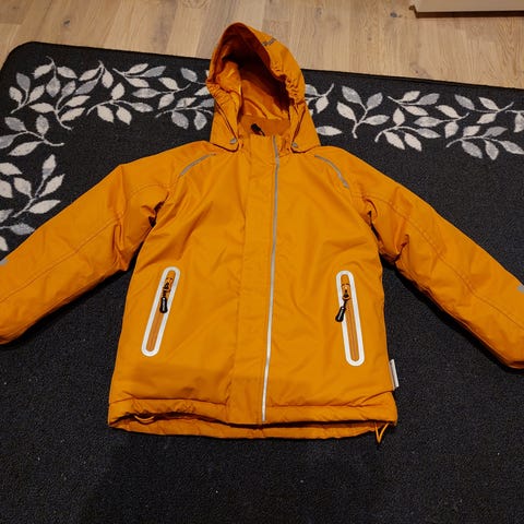 Jonathanin oranssi toppatakki koko 122cm. Takissa heijastimia, irrotettava karvareunuksellinen huppu, myös pelkän karvareunan voi irrottaa...