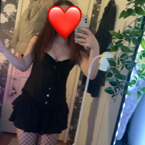 Todellat tukeva ja laadukas punamusta korsetti aitoa lampaan nappanahkaa. Puuvillavuori. Edessä plansetti ja takana nyöritys. Pehmustetut kupit. Teräsluut. Lenkit sukkanauhoille (sukkanauhoja ei mukana). Nyörityksen alla ei ole panelia. Koko S / 8.