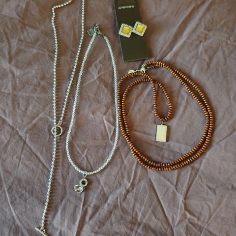 Snö of Sweden kaulakoru. Hopean väriset metalliosat, lilat lasihelmet. Hieman kulumaa metalliosissa.