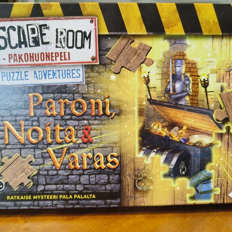 Pakohuonepeli. On pelattu ja tehtäviä tehty. Silti pystyy pelamaan, vaikka onkin taiteltuja jälkiä tai sitten voi tulostaa kokonaan uudet tehtävät ilman jälkiä. Mutta pelattavassa kunnossa on.