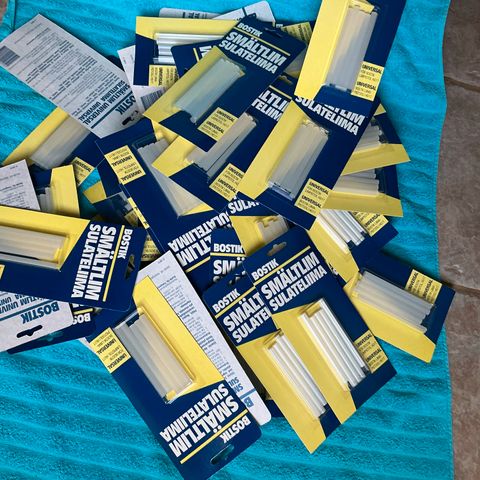Myydään 5 pakettia 8mm x 100mm kuumaliima. Paketissa on 12 kpl kuumaliimapuikkoja. Hinta 10€ 5 paketista.