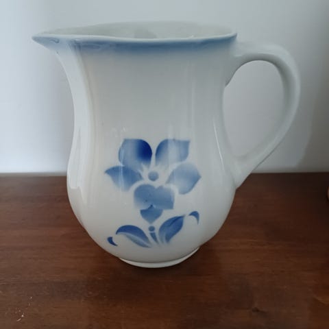 Suun halkaisia: n.10cm. Korkeus: 17cm. Vetoisuus: 1 litra. Valmistusvuosi: 1932-49. Lohkeamat on huomioitu hinnassa. 60€+postituskulut. Postitus perjantaisin. Myynnissä myös muualla.