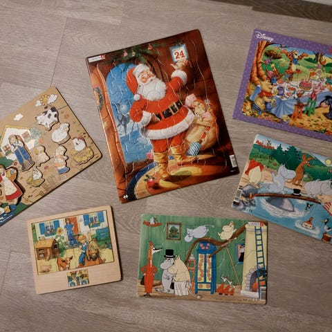 7 erilaista, esim. 2 muumipalapeliä, kuorma-auto.