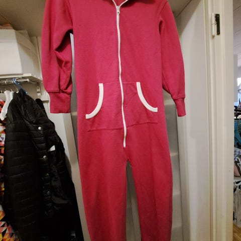 Hyväkuntoinen vähänkäytetty hupullinen tyttöjen jumpsuit oloasu, jossa on vaaleanpunaisia kuvioita, näkyvät huonosti kuvassa