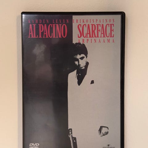Kahden levyn erikoispainos. Al Pacino tekee elokuvassa unohtumattoman roolisuorituksen arpinaamaisena Tony Montanana, joka raivaa tiensä Miamin kokaiini-imperiumin huipulle. Elokuvan kesto 2h 44min. DVD on uusi, kaupan muoveissa. Mahdolliset lähetyskulut lisätään hintaan.