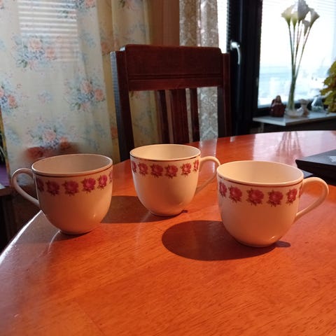 Myydään kuvan kahvikupit alulautasen /tassin kera, kahvikuppeja ilman tassia ja tasseja ilman kuppeja.