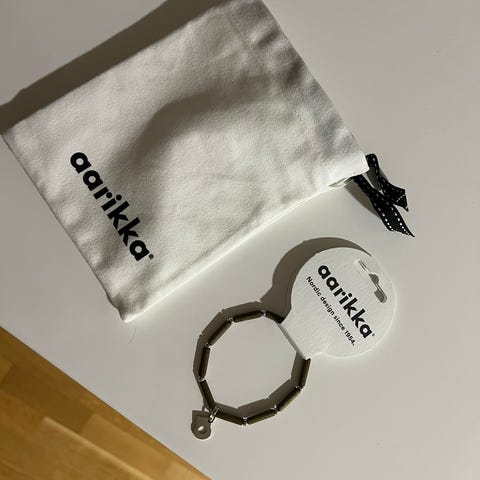 Käyttämätön Aarikka rannekoru, lappu yhä kiinni. Ruskeat puuhelmet, litteät hopeanväriset metallihelmet.