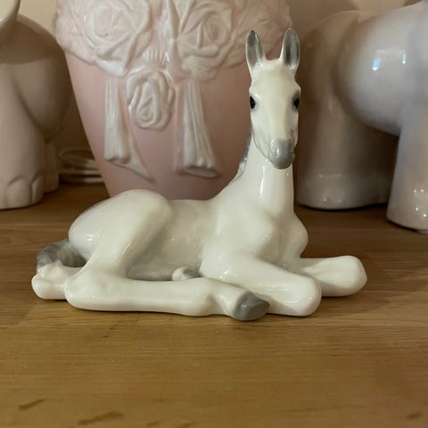 Oranssi posliini virtahepo. Korkeus noin 14,5 cm, Tuotu Neuvostoliitosta -80 luvulla. Ehjä. Jos oikein tarkasti katsoo huomaa valmistusvaiheessa on tullut epätasaisuutta joihinkin kohtiin.
