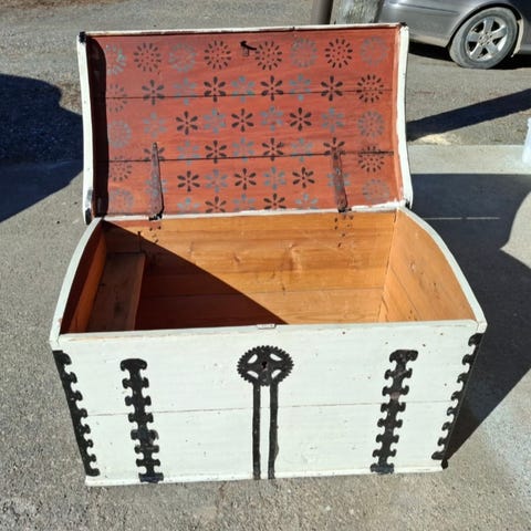 Vanha hieno puuarkku ,hyvän kokoinen,avaikin tallella ja toimii.säilytystilaa hyvin.hinta 45e mitat,korkeus 60cm, leveys 87cm , syvyys 54cm