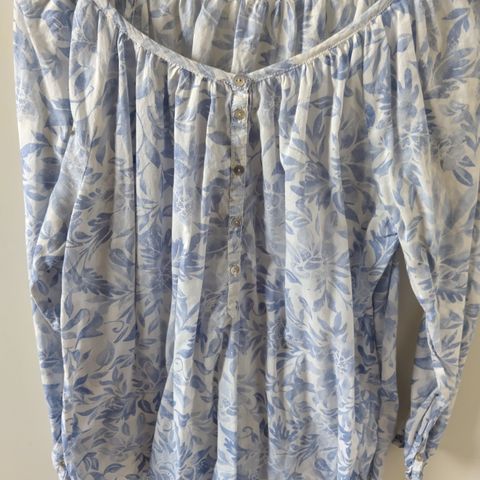 Tummansinisellä pohjalla valkeita pieniä pilkkuja sekä eläinaiheisia kuvioita. Hihansuissa 2 napin kiinnitys. Sopii 50/52 kokoiselle naiselle.
